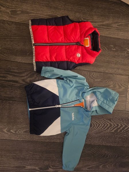 Två ytterplagg från Timberland. En röd och marinblå vadderad väst använt fåtal gånger och en grön, vit och marinblå jacka med huva ej använt. Stl 74.