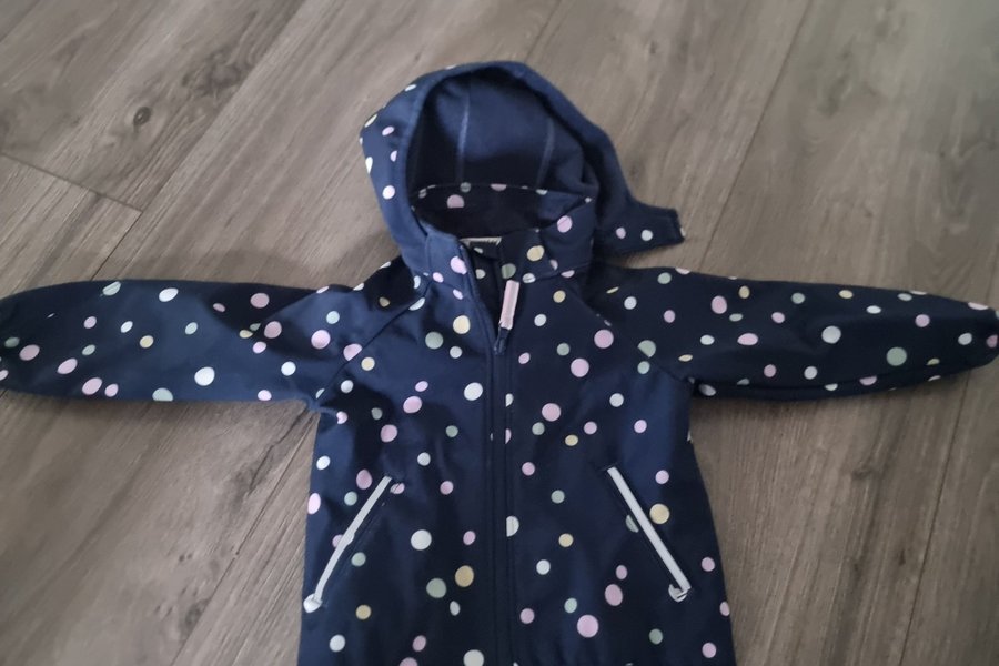En mörkblå jacka med färgglada prickar i olika storlekar. Jackan har en dragkedja framtill och två fickor. Huvan är fäst och har en mjuk insida.