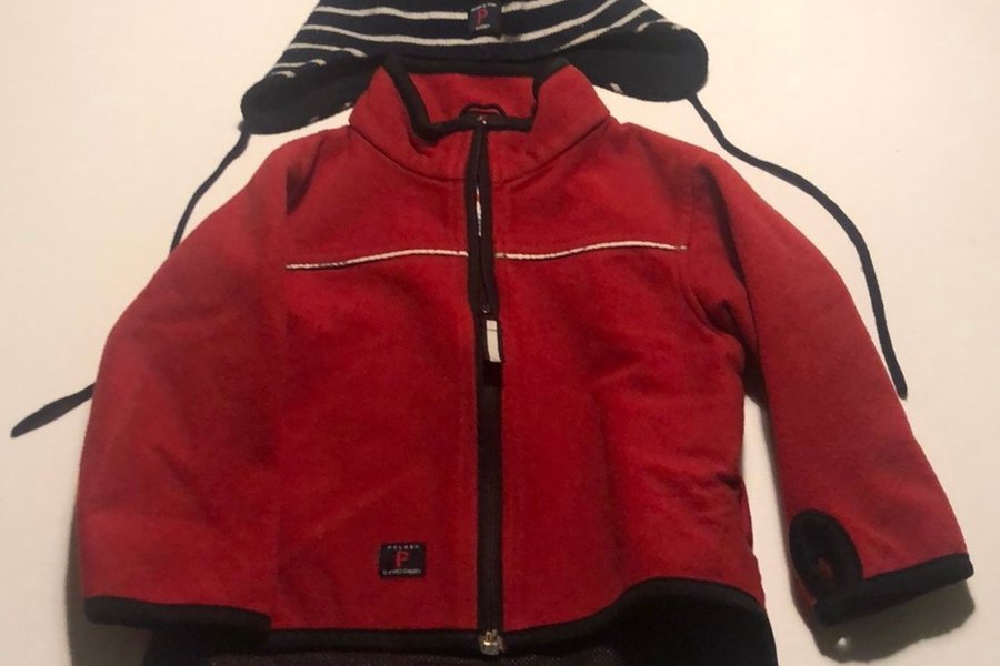 Vårdpaket! ??En röd PO.P-jacka (stl 86) med dragkedja framtill och svarta detaljer. Jackan har en liten etikett på vänster sida framtill. Tillsammans med jackan finns en randig PO.P-mössa (stl 48/50) i mörkblått och vitt med knytband.