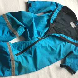 Vadderad jacka i en klarblå färg med quiltat mönster. Jackan har en dragkedja framtill och en avtagbar huva. Kanterna är avslutade med ett grått band, resår vid ärmslut