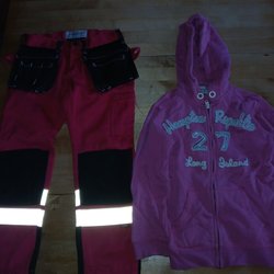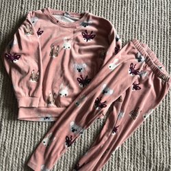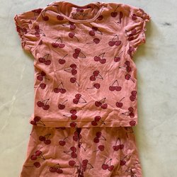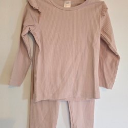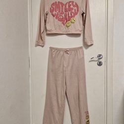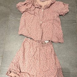 Ett sött set bestående av en topp och byxor. Toppen har en liten volang nedtill och knäpps med en knapp i nacken. Både toppen och byxorna har ett blommigt mönster.