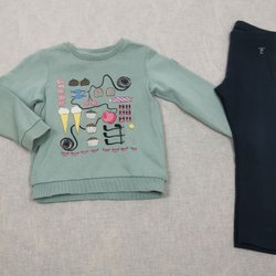 Säljer ett set bestående av en långärmad tröja som är beige i färgen och har motiv på stadsmiljö, samt ett par svarta byxor.