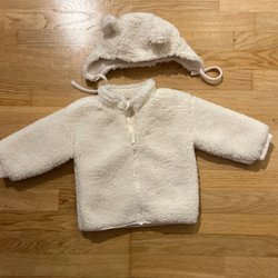 Ett set med en fleecejacka med bilar och ett par fleecebyxor med svarta prickar.