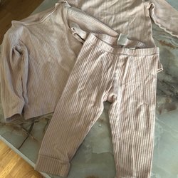 Ett litet sött set med en ljusgul, ribbad jumpsuit från Bebe (Lager 157) och en blommig pyjamas/jumpsuit med korta armar och ben från H&M.