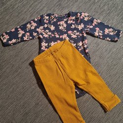 Ett sött set från Newbie, bestående av en ljusrosa långärmad tröja med spetsdetaljer och ett par mörkgrå leggings med blommigt mönster.