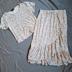 Ett set med en ljusrosa kofta med volangdetaljer och en grå kjol med spetskant. Koftan har knappar framtill och kjolen har en resårlinning.