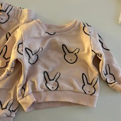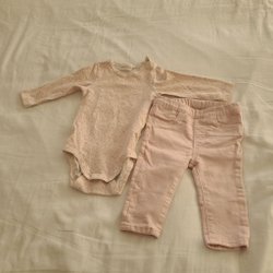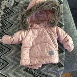 Ett set med jacka och byxor i en rosa färg. Jackan har en huva och byxorna har hängslen.