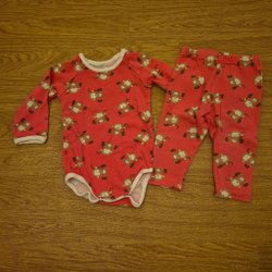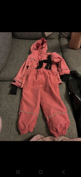 Ett set med jacka och byxor i en rosa färg. Jackan har en huva och byxorna har hängslen.