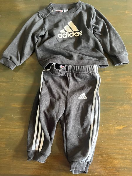 Ett sött Adidas set med tröja och byxor. Tröjan har tryck av Adidas logga framtill och knappar på axeln. Byxorna har resår i midjan och tre ränder längs benen, samt Adidas logga. Fint skick. Kommer från djur- och rökfritt hem.