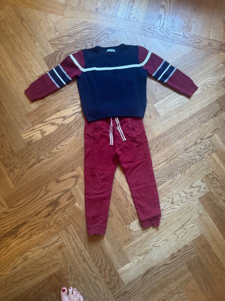 Ett set med en mörkblå tröja med vita och vinröda detaljer på ärmarna och bröstet, tillsammans med ett par vinröda byxor med dragsko.