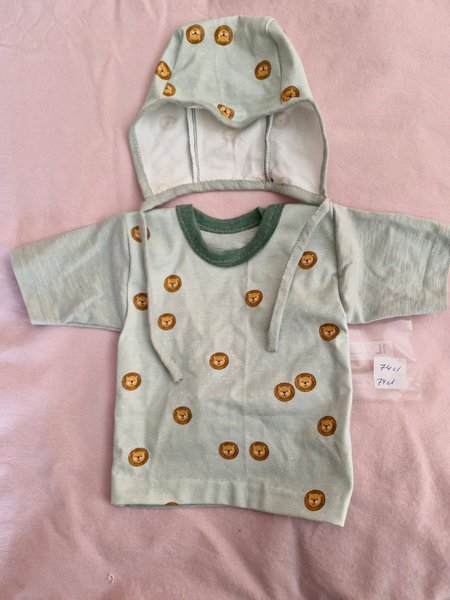 Hemsydda barnkläder, mestadels bomull. Tröja och mössa med små lejonansikten. 74 cl