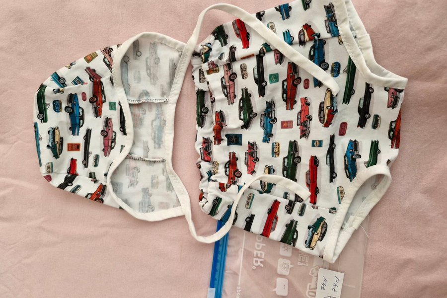 Hemsydda barnkläder, mestadels bomull. Mössa och blöjbyxa med amerikanska bilar. 74 cl