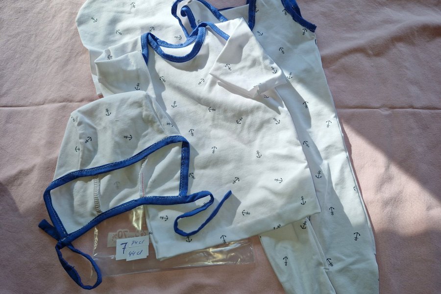 Hemsydda barnkläder, mestadels bomull. Sparkbyxa 44 cl, 2 mössor och en tröja 74 cl
