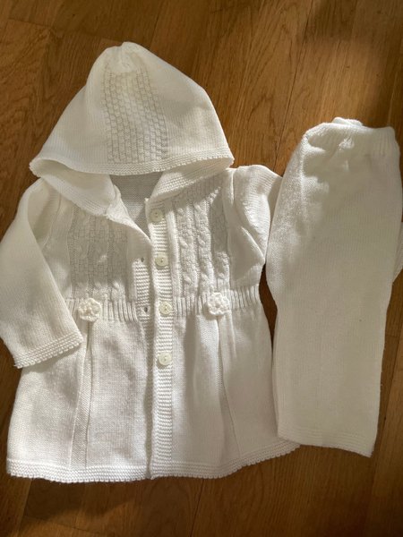 Set med en vit kofta och matchande byxor. Koftan har en huva, knappar framtill och dekorativa blomdetaljer. Byxorna har en resår i midjan för en bekväm passform.