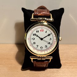 Ett armbandsur från Eaglemoss Collections. Klockan har en vit urtavla med arabiska siffror och en brun läderarmband. Boetten är silverfärgad. och "Precision Quartz Movement".