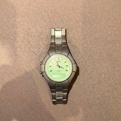 Casio armbandsur med tidvatten graf, termometer och illuminator. Klockan har en rostfri stål baksida och är vattentät till 10 bar. Den har funktioner som auto-ljus, nedräkningstimer, världstid och alarm chronograph. Urtavlan har repor.