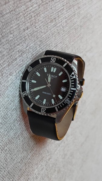 Tissot armbandsur med svart urtavla och svart armband. Klockan är märkt 100M/330FT.