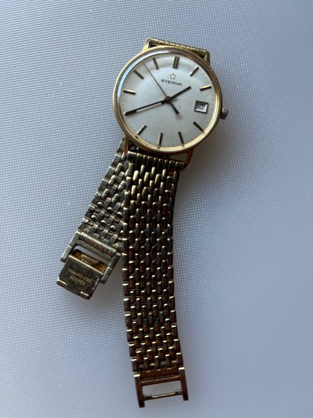 Eterna klocka med ett guldfärgat boett och ett matchande guldfärgat armband. Urtavlan är vit med streckindex och har en datumvisning vid klockan 3. Armbandet är märkt "STAINLESS STEEL KEEPER". Graverad på baksidan. Datumvisningen går ej att ställa, urverket fungerar perfekt.