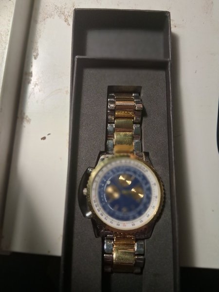 Armbandsur med en blå urtavla och ett tvåfärgat armband. Klockan ligger i en ask.