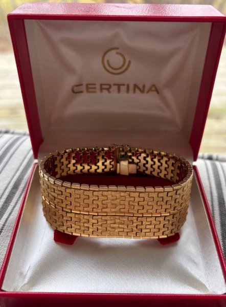 Elegant armband som har en detaljerad mönstrad yta och ett säkert lås. Certina-märkt ask.