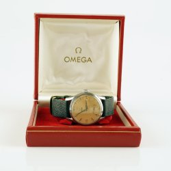Omega manuellt uppdragbar klocka med ett brunt läderarmband. Urtavlan är silverfärgad med guldfärgade siffror och indexmarkeringar. Boetten är i rostfritt stål. Klockan har ett urverk med 17 juveler.