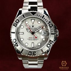 Full set — box, warranty card, manuals, Omega steel bracelet, Heritage Timepieces certificate of authenticity.