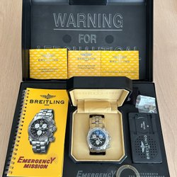 Breitling Emergency Mission Chronometer. Klockan kommer med tillbehör som syns på bilderna. Service papper medföljer. Orginalkvitto, senaste servicen där urtavlan byttes då den va lite solblekt gick på 14890kr. Inte använts sista åren.