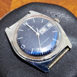 Fin timex från 1971. Funktion är osäker ibland går den bra och ibland måste man hjälpa till samt att rotorn ej vrider upp fjädern men går att dra upp som en vanlig mekanisk klocka och när den går så håller den tiden ganska bra och ändrar datum men då jag säljer denna som repobjekt även om den funkar så lämnas ingen garanti så studera bilder noga och gör en egen bedömning. Boetten är rengjord i ultraljudstvätt samt packning är bytt till locket och skicket är ganska bra men finns tecken på användning. Glaset är i bra skick men med tecken på användning. Tavlan, datum skiva och visare är i bra skick men finns ålderstecken. Kronan känns bra och det är inga problem med uppvridning samt justering av visare och datum.