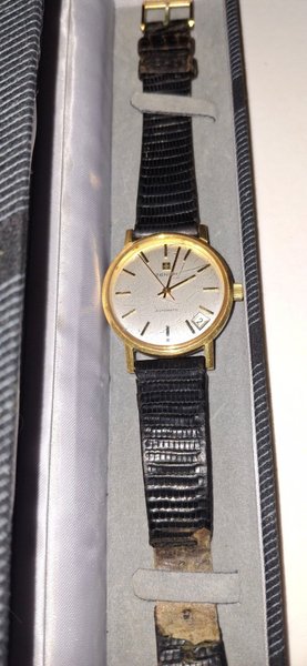Zenith automatisk herrklocka med datumfunktion. Klockan har en guldfärgad boett och en svart läderrem. Urtavlan är ljus med streckindex och visare i guldton. Datumfönstret är placerat vid klockan 4-5. Remmen visar tecken på slitage.