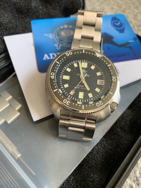 Addiesdive automatiskt dykarur med svart urtavla och datumvisning. Klockan har en boett i rostfritt stål och ett länkarmband i metall. Vattentålig till 200m. Captain willard efterliknelse många isbad och bastuturer, tung pjäs, går som tåget!!! ??