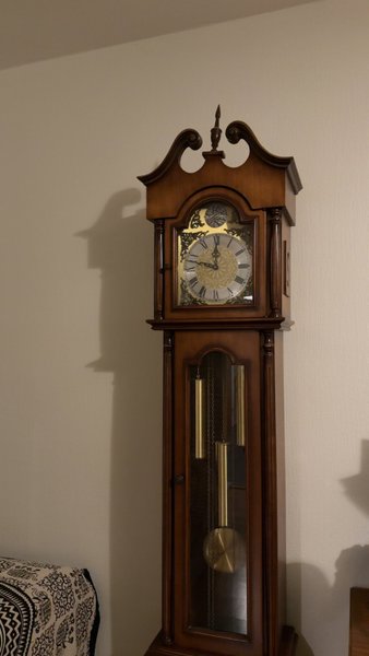 Golvur med romerska siffror och detaljer i mässing. Uret har ett pendelurverk och synliga vikter. Klockan är tillverkad i trä med en klassisk design.