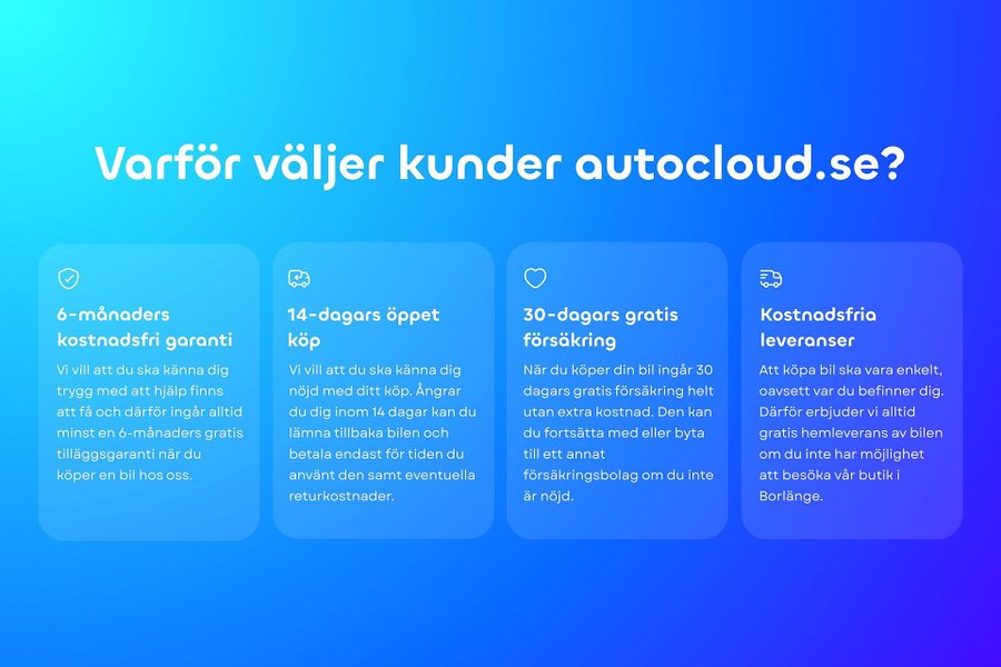 När du köper bil hos oss ska det kännas enkelt och tryggt. Därför levereras alla våra bilar med minst 6 månaders garanti via Fragus Group samt 30 dagars kostnadsfri försäkring från Länsförsäkringar. Du ska kunna köra iväg utan att oroa dig.