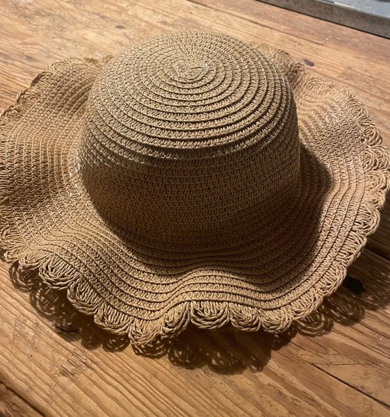 En stråhatt med en bred, vågig brätte. Hatten har en klassisk design med en rundad kulle och är tillverkad av flätat material. Brättet har en dekorativ, vågig kant som ger hatten en elegant touch. Hatten är i en ljusbrun nyans.ca 3-4 år