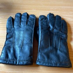 Ett par handskar i svart läder och fuskpäls med ett mönster i storlek 7