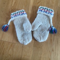 Ett par handstickade lovikkavantar i ljus färg med ett mönstrat band i rosa och grönt runt handleden. Vantarna har även små tofsar. Sparsamt använda