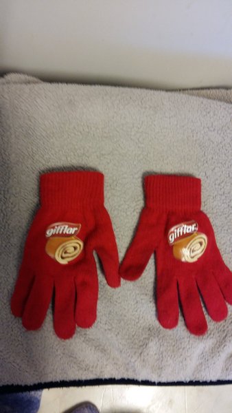 Ett parstickade röda vantar med en logotyp av "gifflar" på framsidan.