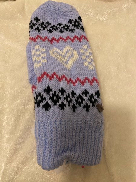 Stickad vante i ljusblått med mönster i svart, rosa och vitt. Vanten har ett hjärtmönster.