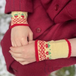 Ett par handstickade handledsvärmare med ett vackert blommönster i rött och grönt mot en vit bakgrund. Perfekt för att hålla handlederna varma under kyliga dagar. Mjuka och varma, stickade av Baby Merinoull.