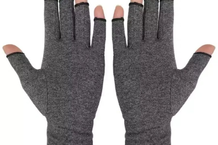 Ett par grå handskar utan fingertoppar.