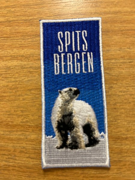 Broderad tygmärke med motiv av en isbjörn och texten "SPITSBERGEN".
