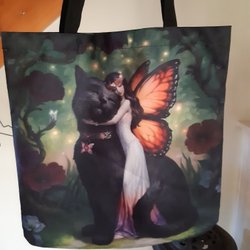 En söt hemgjord tygväska med ett kattunge-mönster. Väskan har svarta handtag.