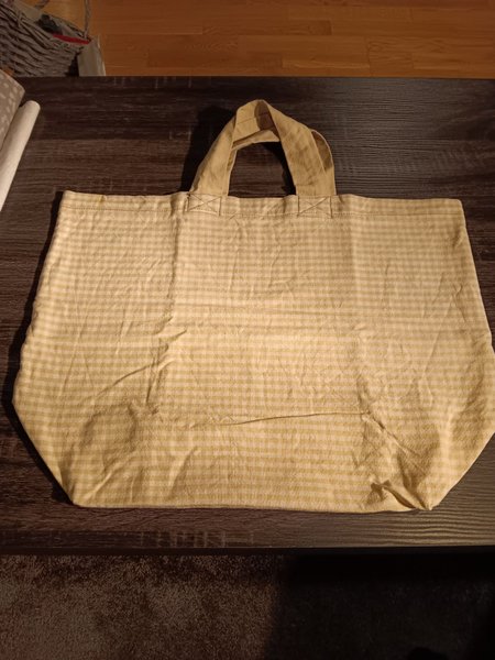 Beige tygväska med handtag och ett diskret rutmönster. Väskan är rymlig och perfekt för shopping eller som en praktisk vardagsväska.