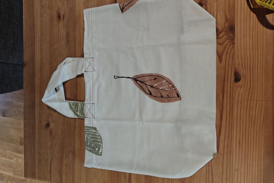 Vit tygväska med tryck av löv i olika färger. Väskan har två handtag.