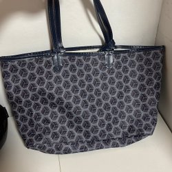 Handgjord tygväska i blått och grått med ett unikt mönster. Väskan har ett blåvitt rutigt foder med innerfack. Perfekt för shopping eller som en stilfull. 37 x 35 cm exklusive handtagen.