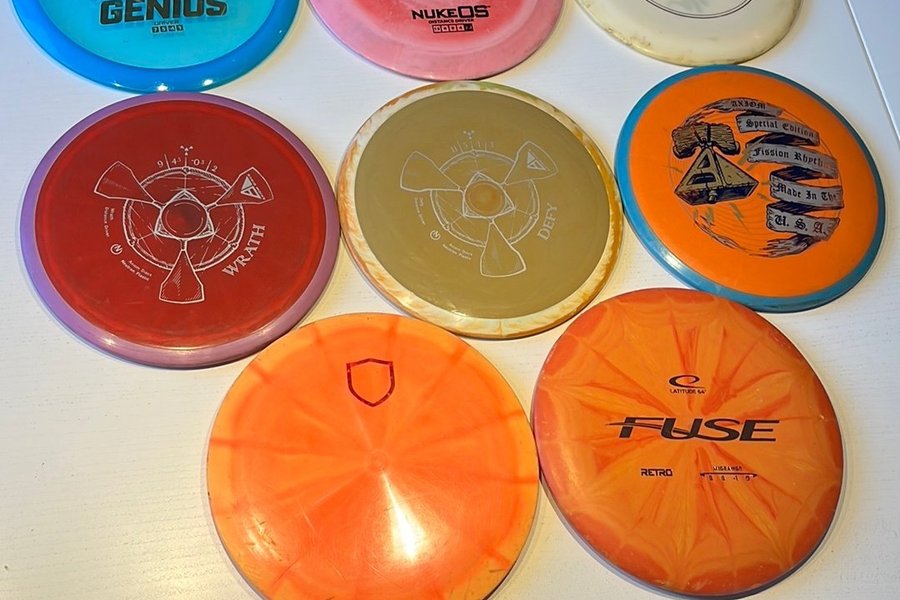 Här är en samling disc golf discar. Inkluderar märken som Discmania, Discraft, Innova, Axiom och Latitude 64. Modeller inkluderar Genius, Nuke OS, Pro Beast, Wrath, Defy, Fission Rythm och Fuse.