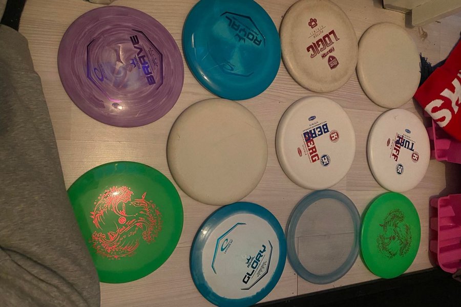 Ett set med discgolfdiscar från olika märken. Inkluderar Latitude 64 Royal Brave, Latitude 64 Royal Glory, Discmania Evolution Logic, Kastaplast Berg och Kastaplast Tuff.