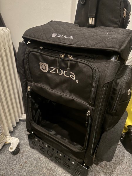 Zuca Discgolf väska i svart. Väskan har flera fack med dragkedja och en robust ram. Den har ett utdragbart handtag och hjul för enkel transport.
