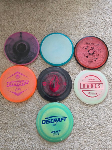 Säljer ett paket med sju discgolfdiscar. 2st Pure, Harp, Deflector, Hades, Heat, samt en Swirly S-Line PD2