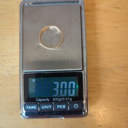 Ring i 18 karat guld utan ädelstenar. Ringen väger cirka 3,25 gram och har ett innermått på ungefär 52 mm. Den är graverad med namn och datum.
