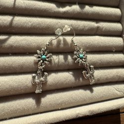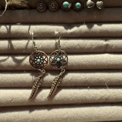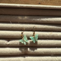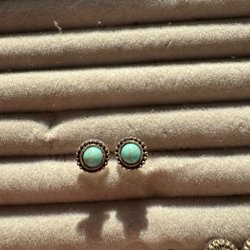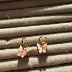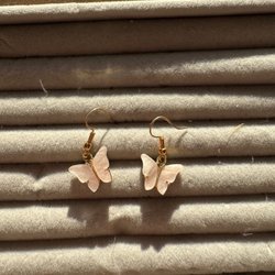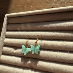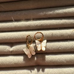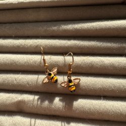 Örhängen/hoops med stängbar baksida. Lite skiftande i färg så svårt att avgöra om de från början var guldiga eller silvriga. Nu har de en ljus guldfärg skulle jag uppskatta